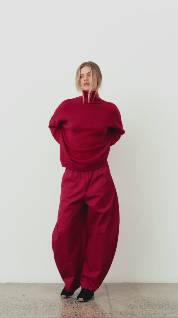 bold and relaxed, the batched sweater in red is shaped through a slouchy silhouette with a ribbed polo neckline and soft volume through the body. designed in a merino blend knit that brings warmth with a refined finish