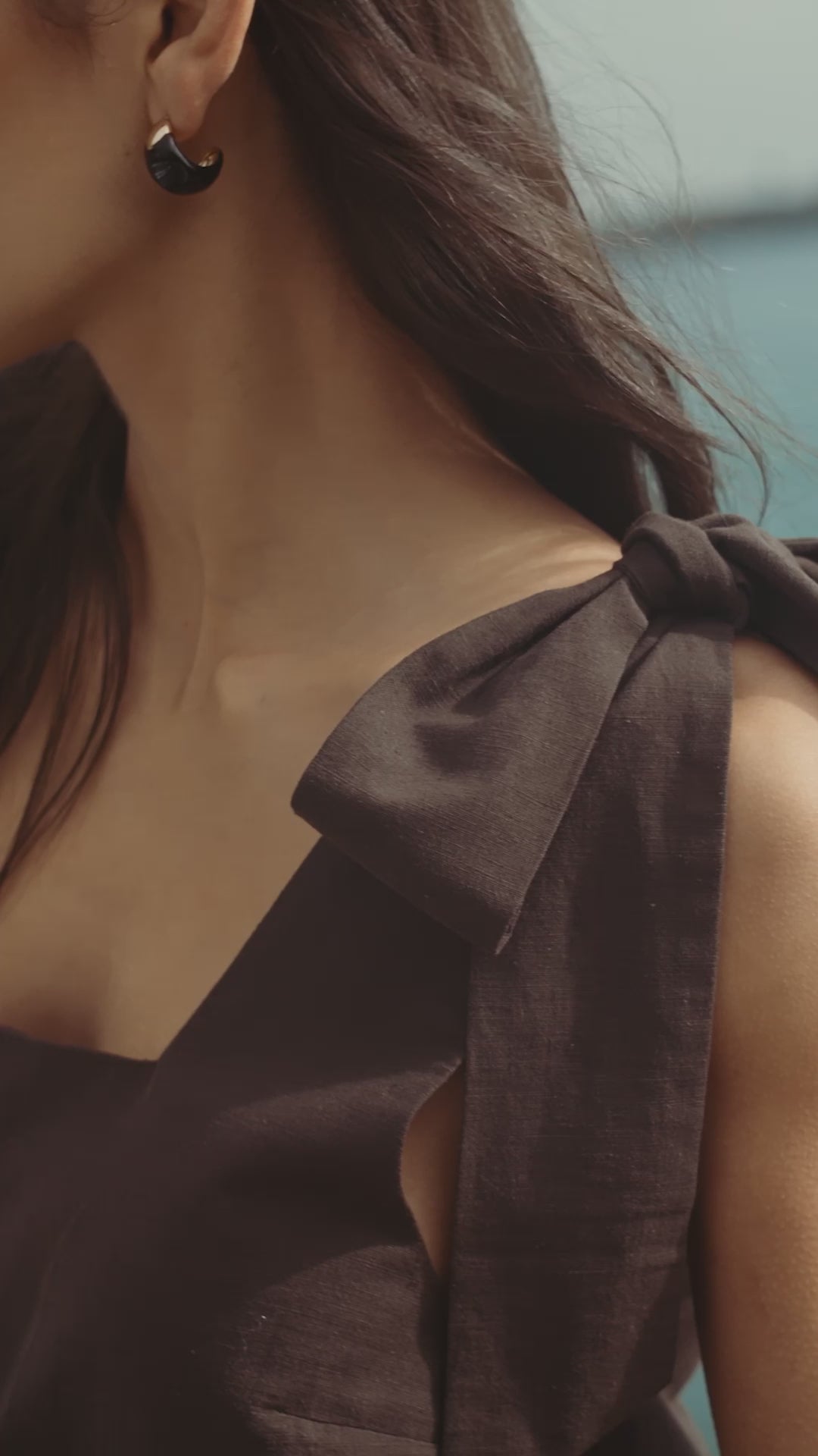 fluid and feminine, the bowie midi dress in chocolate brown captures ease through its relaxed silhouette and shoulder tie detailing. wear bowed or knotted to shift the look, keeping the mood laidback yet refined. hero alone with the charm sandal for a resort edit, or layer with the refine tee for added depth
