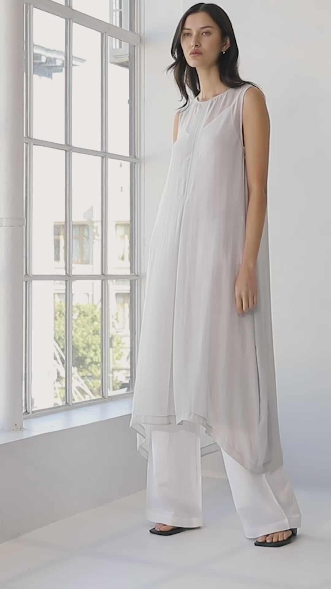 details considered, we introduce the complete dress in oyster as your midi length dress to take you into spring. crafted in a lightweight recycled chiffon, and featuring front pleats, voluminous side details with a cocoon silhoutte. complete the look with the slide slip and enclose slides, or opt for layering items like the coached pant and follow crop to aide with your styling
