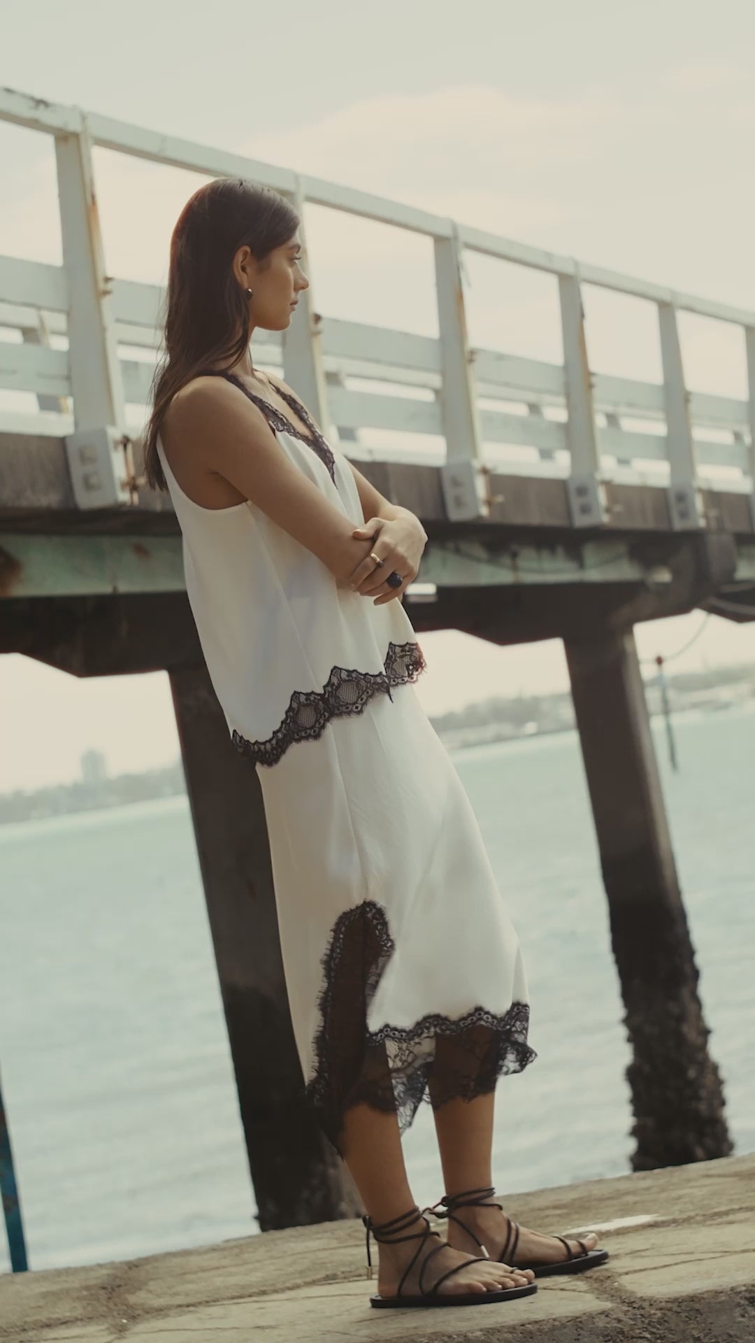 a cami with edge. the cut cami introduces contrast lace across the neckline, straps, and hemline for graphic detail against a fluid satin body. scooped armholes balance softness with structure, wear as a matched set with the cut frame skirt or pair back with the recede jean and slant thong