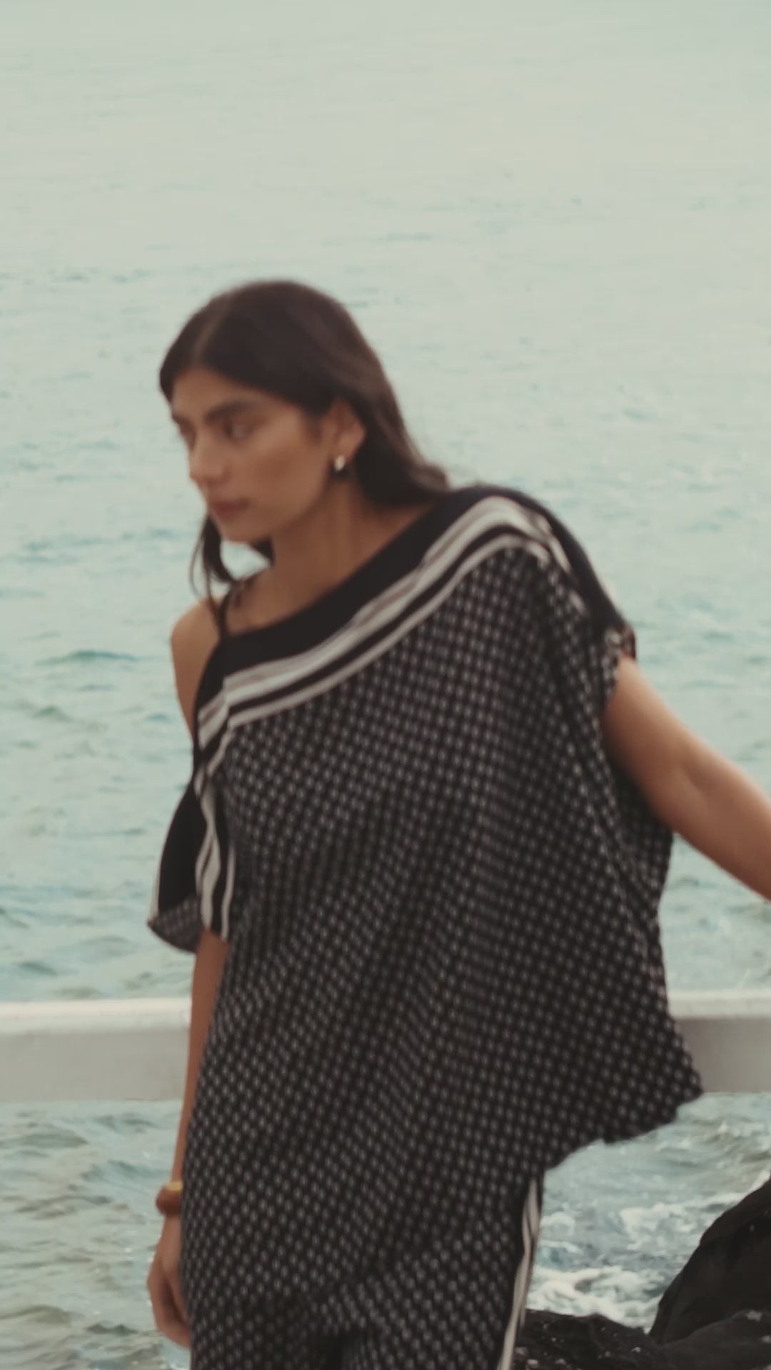 where structure meets movement, the ethereal cape top in black border print brings directional flow through its asymmetric neckline and off shoulder drape. featuring a single strap detail for balance, adding shape to the fluid silhouette. pair with the glow pant to complete the set, or style with the luxe furtive short and loft heel for a modern edge