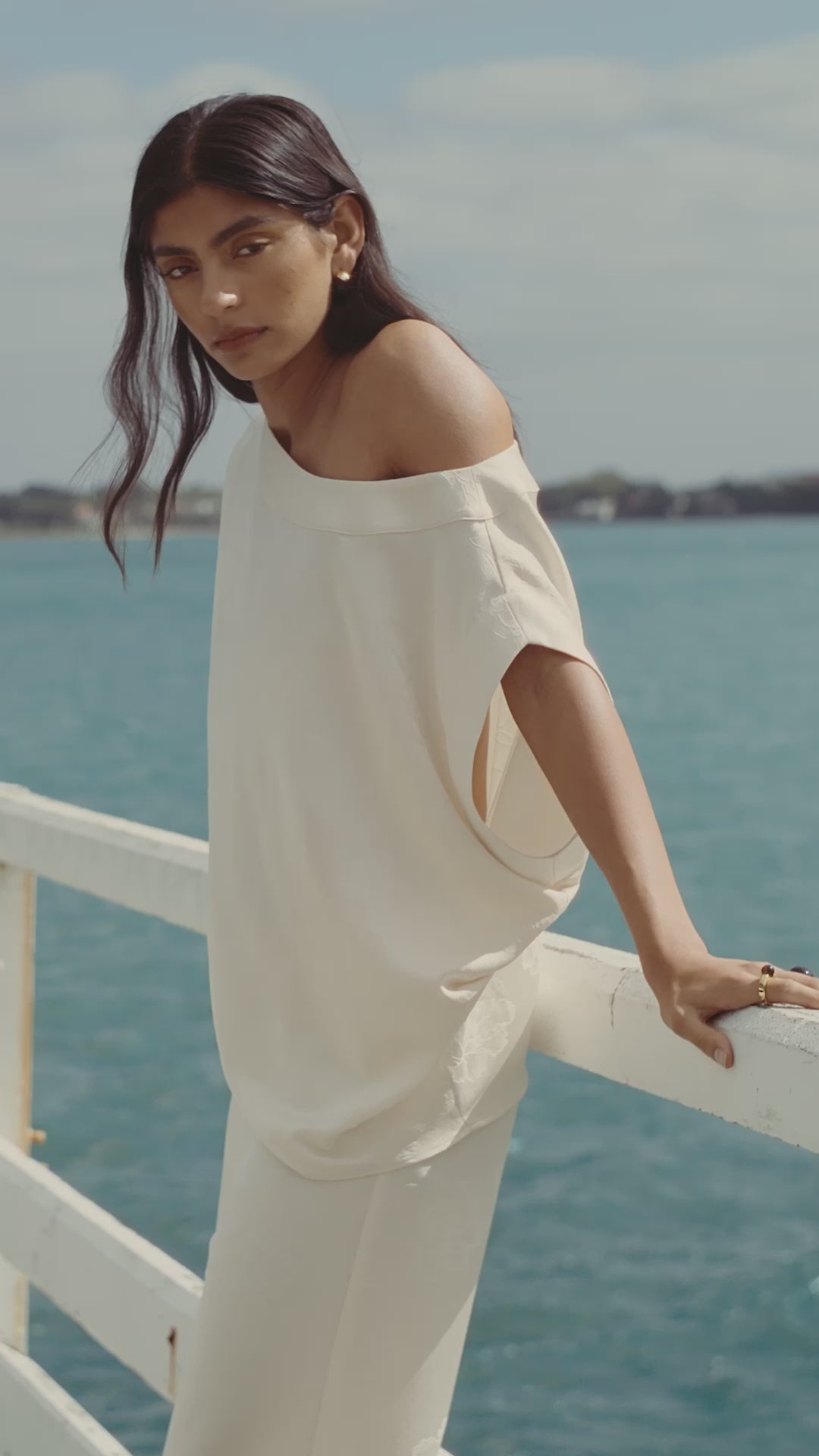 the inter short sleeve top explores cocoon shaping in a soft satin jacquard finish, refined through a wide boat neckline and pleat detail that drapes naturally through the body. sleeves fall with ease, while the silhouette holds volume without overwhelm, offering versatility for layering or stand alone wear. style with the coordinating frame pant for a complete look, or offset with denim for relaxed contrast