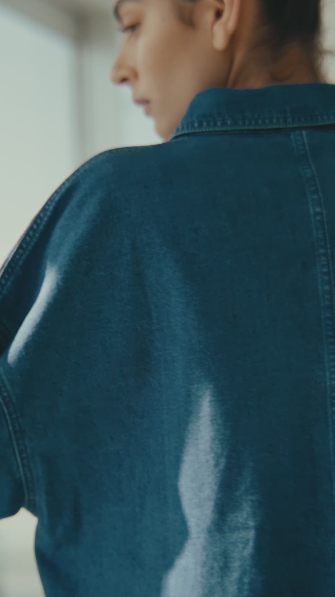 in washed indigo, the radier shacket reimagines utility through a relaxed silhouette and soft denim construction. featuring wide full length sleeves, oversized pockets, and brass button detailing for a directional edge. designed with a swing through the side and back panels for ease of movement. layer over tonal separates or pair with the coordinating radier short for a contemporary denim set