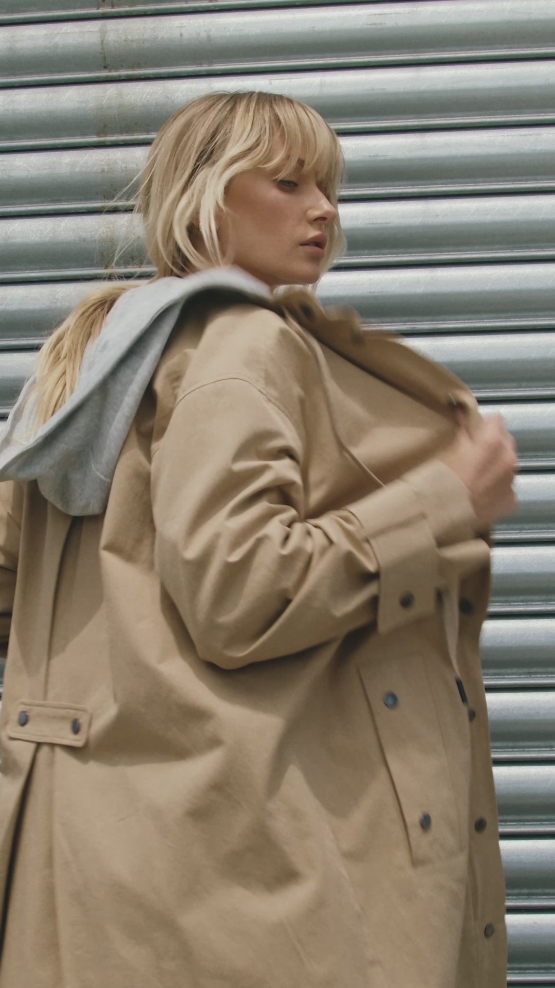 your off-duty layer to ease into the cooler seasons, the relieve trench in camel will be your outerwear essential with a difference. functional in design with a detachable contrast hood, this fully lined coat features athleisure inspired details and is relaxed in fit. style over the concept varisty sweat and furthering trackpant for a sporty mood